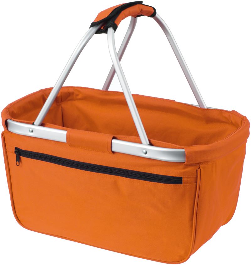 Nakupovalna košara s aluminijastim ogrodjem in zadnjim žepom na zadrgo. Košara je zložljiva in ima dimenzije 45x25/45x25 cm.